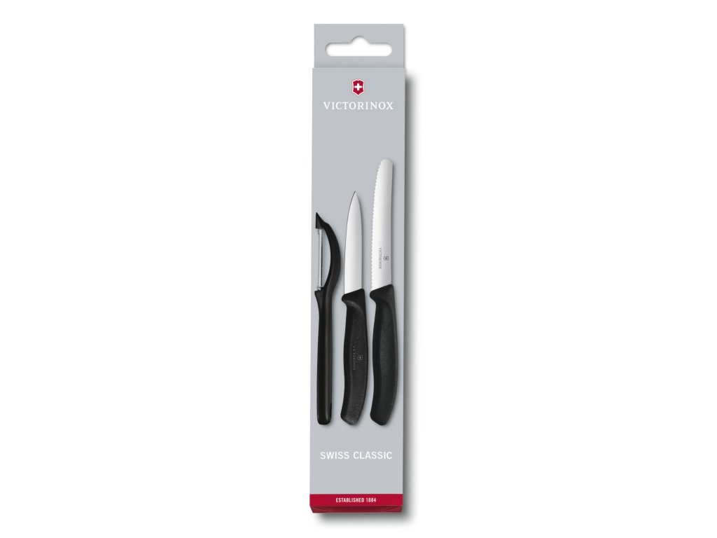 • a paring knife with an 8 cm blade• a vegetable knife with an 11 cm serrated blade• a fruit and vegetable peeler