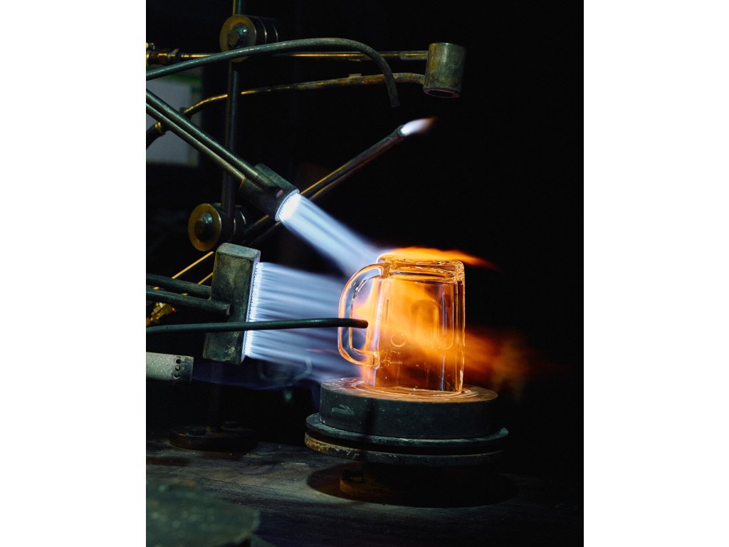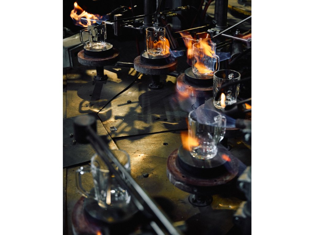 Při výrobě půllitrů využili skláři technologii lisování pivního skla – rozžhavenou sklovinu dávkovali do třídílné formy, po vylisování půllitry putovaly na sérii hořáků k finálnímu leštění a následně do chladicí pece, kde několik hodin pozvolna uvolňovaly vnitřní pnutí, aby sklo samovolně nepopraskalo a stalo se odolnější.