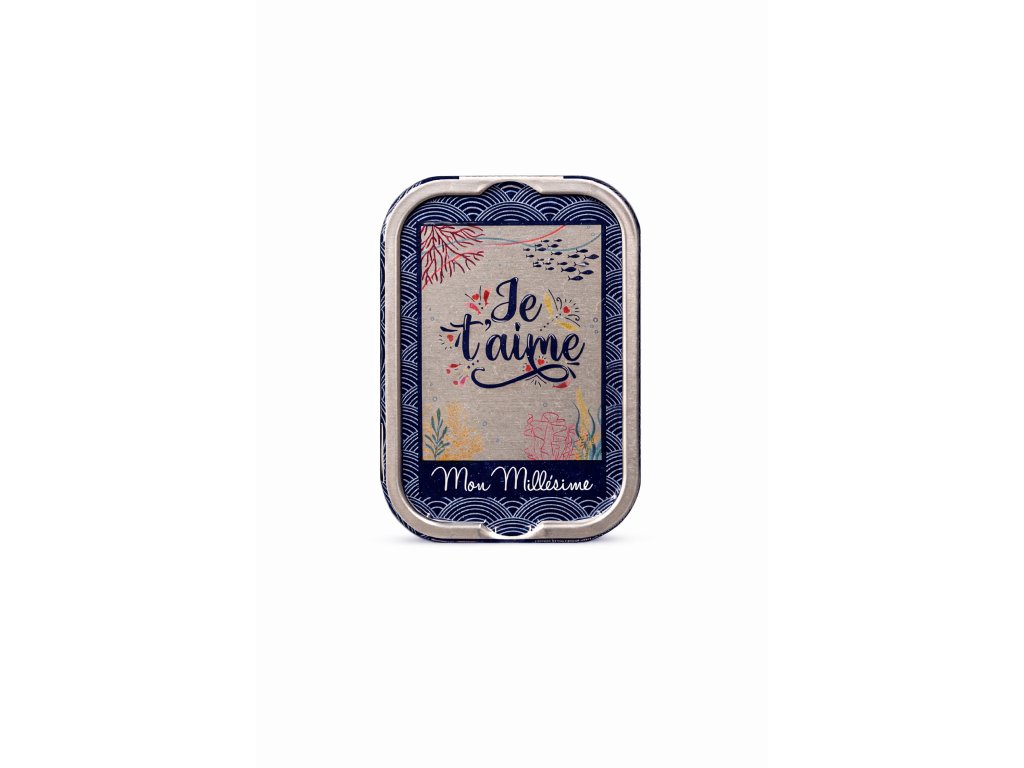 Francouzké sardinky "JE T'AIME". Tyto sardinky se loví na Saint Gilles Croix-de-Vie, zpracovávají se čerstvé a po staru - ručně. Neváhejte je nechat stárnout, časem se zlepšují.