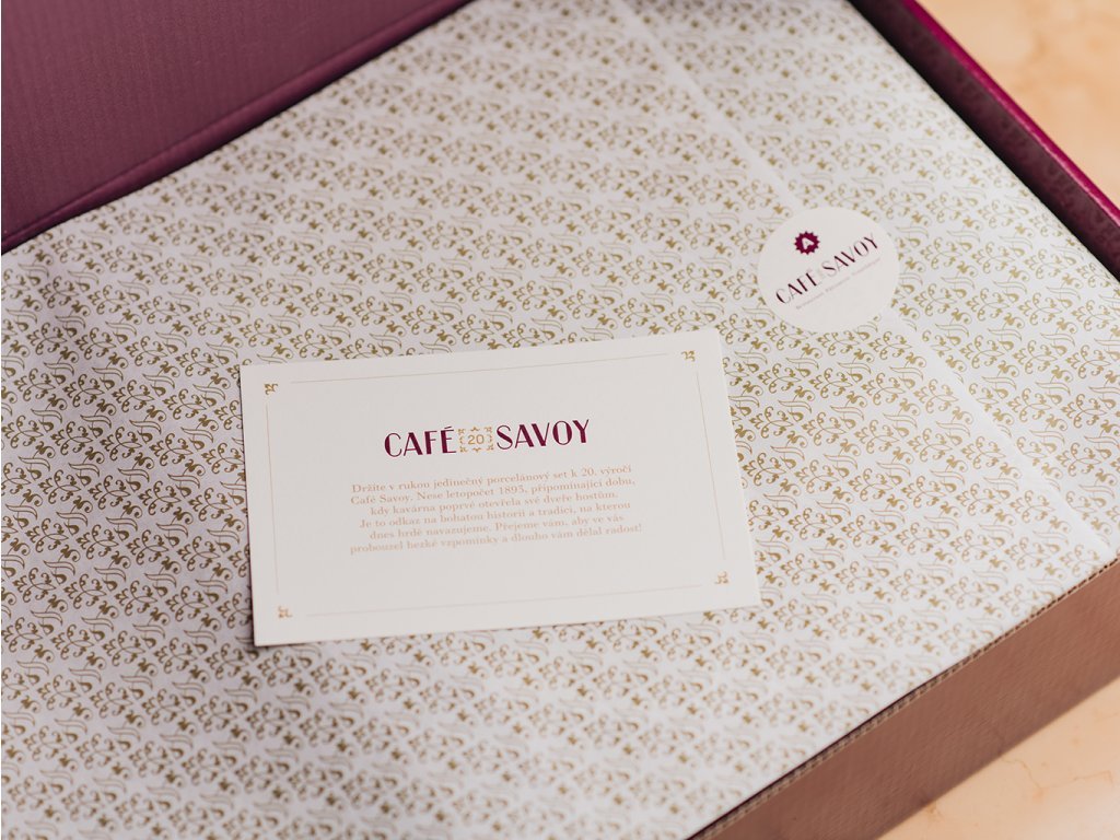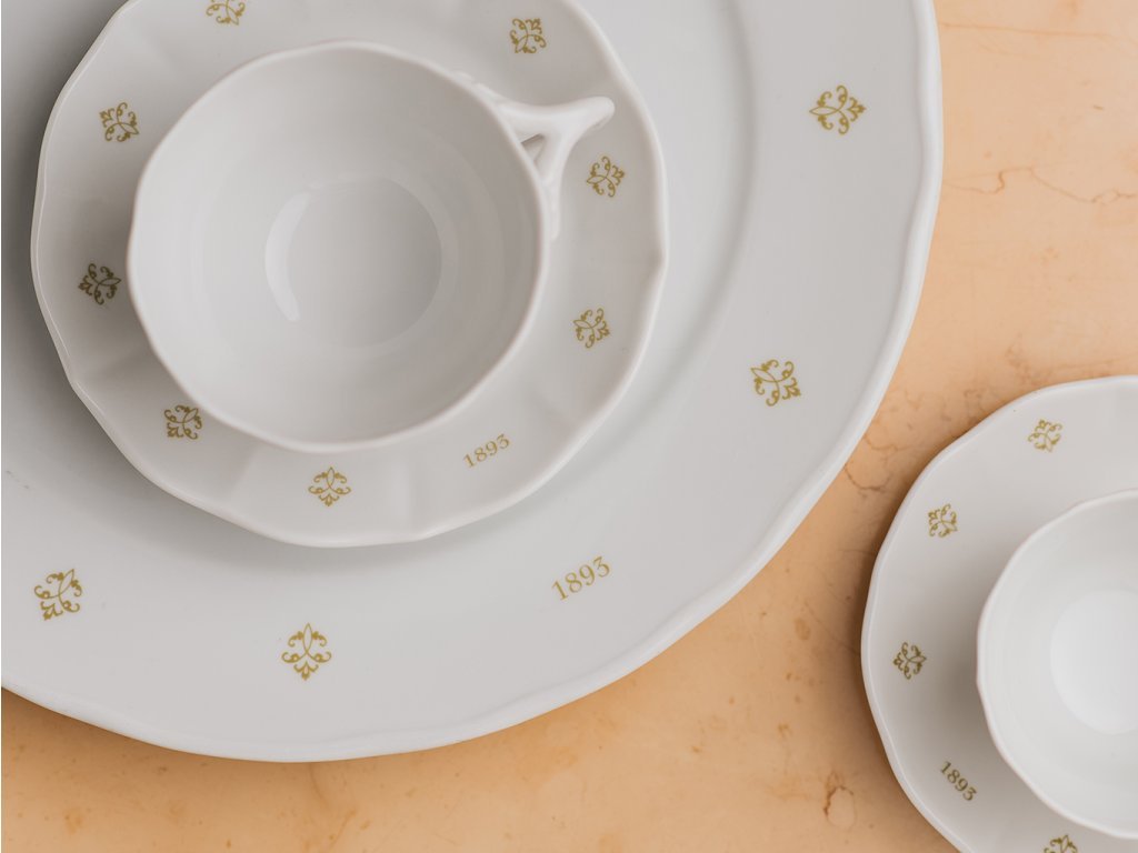 Tento porcelánový set je oslavou dvacetileté historie naší kavárny. Letopočet 1893 odkazuje k našim kořenům i tradici, na kterou hrdě navazujeme. Součástí setu je velký talíř a dva typy hrníčků s podšálkem.